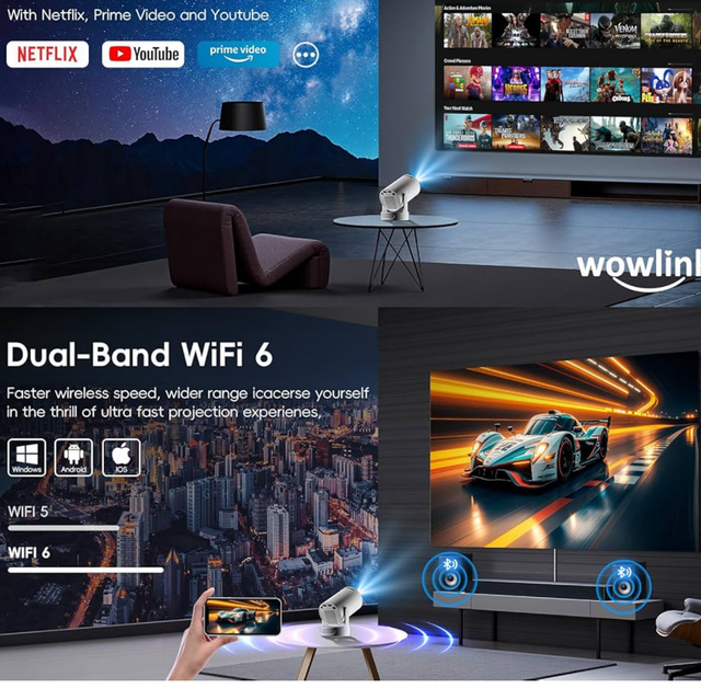 Projecteur Intelligent avec Android TV 11】Le projecteur video équipé d'Android 11, 4k et de la technologie WiFi 6 garantit une connectivité fluide et des performances de pointe pour une expérience visuelle véritablement intelligente.