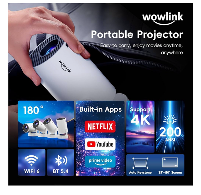1. Videoprojecteur portable Wowlink W210 est dotée de la fonction Air Remote, basée sur la technologie gyroscopique. Vous pouvez contrôler l'écran du projecteur d'un simple mouvement du poignet. Le projecteur W210 intègre des applications telles que Netflix, Prime Video, YouTube et D+. Regardez des films et des vidéos en un clic, sans appareil externe, et profitez d'une expérience audiovisuelle immersive comme au home cinéma, où et quand vous le souhaitez.
